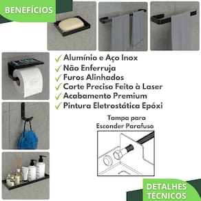 As peças do kit possuem um design clean e sofisticado, suas barras são de alumínio maciço, o porta shampoo e porta sabonetes são de aço inox, ambos com acabamento em pintura eletrostática epóxi preto fosco garantindo maior durabilidade e resistência, não havendo problemas com ferrugem.