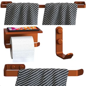 Material Reforçado – Aço carbono de alta resistência, ideal para uso diário Não Enferruja Fácil – Acabamento premium que protege contra umidade e corrosão Design Clean e Sofisticado – Cor Rose Gold para um visual moderno e elegante Instalação Prática – Furos alinhados, parafusos sextavados e tampas de acabamento para um acabamento impecável Funcional – Porta papel higiênico com prateleira superior para apoiar celular, aromatizador ou pequenos itens decorativos
