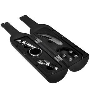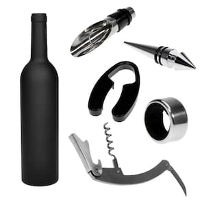 Inclui: - Estojo emborrachado em formato de garrafa - Abridor multifuncional saca rolha em inox - Tampa em inox com dosador - Anel salva gotas em inox - Cortador de lacre