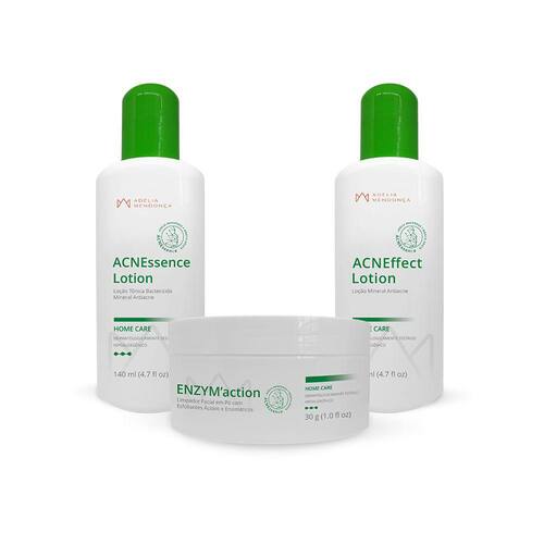 ENZYM`action é um limpador enzimático em pó que desobstrui os poros, remove pontos escuros e promove uma esfoliação suave através da combinação de múltiplas enzimas e ácidos. Sua ação profunda degrada o sebo e a queratina superficiais, enquanto promove um lixamento no interior dos poros, eliminando comedões de forma eficiente. Sua formulação também é rica em oligoelementos e ingredientes dermoativos calmantes, que diminuem os sintomas de irritação cutânea, fortalecem o sistema imunológico e promovem limpeza profunda, intensificando a renovação celular e sua oxigenação. ACNEssence Lotion é uma suspensão tônica com ação secativa e tonalizante para uso em peles seborreicas e acneicas. Apresenta composição inédita e blend de ativos naturais, nano e biotecnológicos, atuando sinergicamente na pele, proporcionando ação sebo reguladora, cicatrizante, anti-inflamatória, calmante, antioxidante e de controle microbiano. ACNEffect Lotion é uma suspensão antiacne de alta eficiência transdérmica. Sua formulação sinergicamente desenvolvida, agregando ativos nano, biotecnológicos e naturais atuam no controle da acne, proporcionando ação secativa, cicatrizante, regeneradora e bactericida, mantendo o controle da microbiota cutânea e profunda atividade antiacne. Marca: Adélia Mendonça Ean: 7898676040320