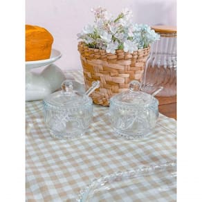 - Composição: 1 Açucareiro Cristal com colher acrílico | 1 Meleira Cristal com pegador acrílico