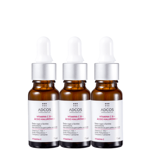 Kit com três séruns anti-idade para peles sensíveis e oleosas. Kit Adcos Vitamina C 15 + Ácido Hialurônico conta com uma textura leve e fluida que não deixa oleosa.