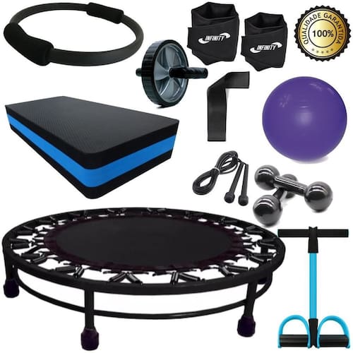 Kit Aeróbico Treino Em Casa Para Funcional Mini jump 32 molas com aro de reforço - cheers O jump - cama elástica trampolim é ideal para o uso em academias, condomínios e residências, além de queimar calorias de forma eficiente. Confeccionado em tubo redondo de aço com aro de reforço, possui pintura em epóxi e tem os pé fixos . São 32 molas para você manter o corpo em forma de uma maneira divertida e saudável. As molas são fixadas á tela por 16 suportes de aço. Pés em pvc antiderrapantes removíveis que se encaixam. O colchonete 90 x 45 x 3 cm é ideal para ter mais conforto na hora de fazer seus exercícios, praticar yoga, pilates ou qualquer exercício funcional. Ele é super prático, fácil de guardar, e é fabricado em espuma de 20 mm com densidade d16, sendo confortável na medida certa. No exterior, é revestido em napa lavável e impermeável, o que facilita quando houver necessidade de higienização e no excesso de suor na prática de exercícios. Você vai se sentir mais confortável para fazer abdominais e outras atividades físicas, além de seu uso ser indispensável para proteger a coluna e evitar lesões. Ações e benefícios: - confortável com enchimento em espuma 20mm de densidade d16 - leve e prático para transporte e armazenamento - tecido lavável e impermeável garante durabilidade do produto - ideal para quaisquer exercícios, prática de yoga, pilates e outras atividades Indicações: - prevenir a coluna e o corpo de lesões em exercícios no solo - ideal para ter mais conforto na prática de quaisquer atividades esportivas Dados técnicos: Tamanho: 90 x 45 x 2 cm Marca: fitness store Material: revestimento em napa com enchimento em espuma 30mm de densidade d23 : 3 meses contra defeito de fabricação Cor: preto Indicações Ideal para o uso em academias, condomínios e residências. Indicado para . Caneleira de peso 5 kg é ideal para a prática de exercícios de ginástica, academia, musculação, etc com peso. São caneleiras profissionais com carga, feitas em capota reforçado, dando mais conforto ao tornozelo. Não absorve suor, é fácil de limpar e higienizar . Possui uma costura dupla de reforço, evitando o vazamento do enchimento. Seu sistema de fechamento é feito em tiras aderentes, garantindo facilidade e segurança na hora de prender a caneleira na perna. Características: Cor: preto Lavável: sim Sistema de fechamento: tiras aderentes Outros: confortável ao tornozelo, não absorve suor, fácil de higienizar, possui costura reforçada evitando o vazamento do enchimento. Membros ou músculos trabalhados: coxas, abdômens, glúteos, panturrilhas e braços. Material: emborrachado Quantidade: 01 - par caneleira de 5kg Kit composto por: 1- mini jump 1- par de halter emborrachado 3 kg 1- corda de pvc 1- par de caneleira de 5 kg 1- step de eva 60cm x 30cm x 10cm 1 - roda abdominal 1 - mini band forte 1 - extensor elástico com apoio para pés 1 - anel de pilates 1 - bola suiça 55 cm