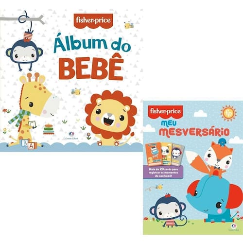 Kit completo inclui álbum do bebê e livro mesversário Fisher Price.
