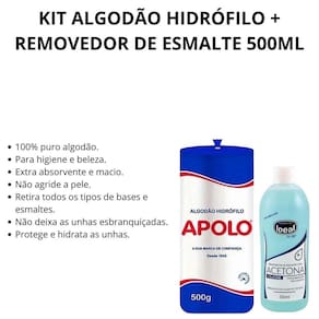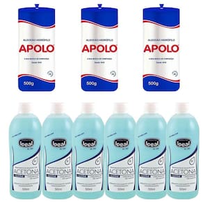 - 03 Algodão Hidrófilo Apolo Em Rolo 500g. - 06 Removedor de Esmaltes Ideal Acetona + Silicone 500ml.