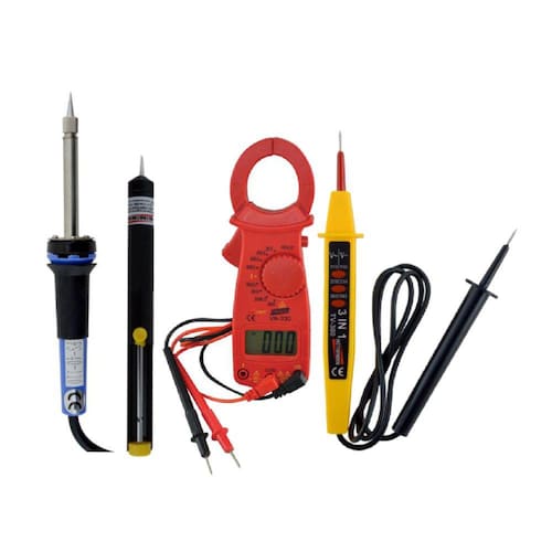 KIT VOLT AMPERÍMETRO DIGITAL PORTÁTIL MOD.VA-330 + FERRO DE SOLDA FS-40-110 + SUGADOR DE SOLDA MOD. SS-20 + TESTADOR DE VOLTAGEM MODELO TV-300 DESCRIÇÃO: O Volt Amperímetro digital portátil mod. VA-330 CAT II - 600 V com display de cristal líquido (LCD) de 3 ½ dígitos. Realiza medições de corrente AC através da garra, tensão AC/ DC, resistência e teste de fio fase por contato, realizado com apenas uma ponta de prova. Conta coma indicação de bateria baixa e indicação de sobre - escala, botão de congelamento de leitura (HOLD). DESTAQUES: Digital, leve, portátil e ergonômico. Realiza teste de fio fase por contato com apenas uma ponta de prova. APLICAÇÕES: Instrumento utilizado para medição de tensão AC / DC, corrente AC, resistência. As medições de corrente são realizadas por meio da garra, ou seja, não é necessário romper o condutor. Ideal para eletricistas e técnicos que necessitam de um equipamento pequeno, leve, compacto e confiável. Em atendimento a NR 10 para medições preventivas e análises de risco. ESPECIFICAÇÕES TÉCNICAS: Display de Cristal Líquido (LCD) de 3 ¾ dígitos Categoria de segurança: CAT II- 600V Data Hold: Congela a leitura no Display Indicador de Bateria fraca Led indicador de fio fase Temperatura de Operação: 0 a 40ºC Umidade de Operação: 75% Alimentação: 2 Pilhas AAA de 1,5V Dimensões: 167 x 65 x 22 mm Peso: 135g (incluindo pilha Dimensões: 167 x 55 x 22 mm Tensão DC: Faixa de medição: 1 V ~ 600 V Escala: 600 V Resolução: 1 V Precisão: ±(1 % + 3 dígitos) Tensão AC: Faixa de medição: 1 V ~ 600 V Escala: 600 V Resolução: 1 V Precisão: ±(1,2% + 3 dígitos) Resistência: Faixa de medição: 1 ? ~ 2 M? Escala: 2 k?, 200 k?, 2 M? Resolução:1 ?, 100 ?, 1 k? Precisão: ±(1 % + 3 dígitos) ACESSÓRIOS FORNECIDOS: Alicate amperímetro VA-330 Ferro de solda FS-40-110 Sugador de solda SS-20 Testador voltagem TV-300 Par de pontas de prova 2 - Pilhas (AAA) Manual de instruções
