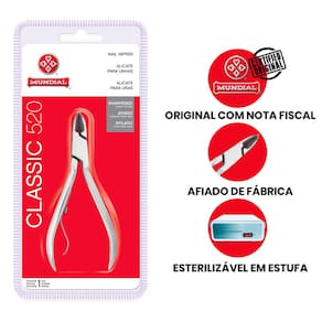 Características Principais:??Alicate para Unhas Classic 520 Mundial:? - Lâminas afiadas; - Corte preciso e alta durabilidade; - Mola resistente com redutor de atrito; - Cabo liso; - Aço carbono niquelado; - Embalagem: Blister;? - Esterilizável em estufa;? - Não esterilizável em autoclave.?