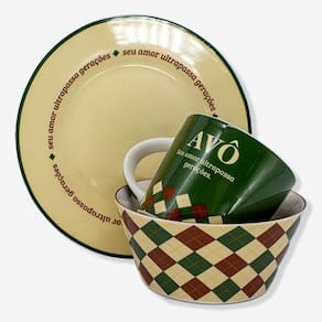 Depois de um dia cheio de aventuras com o seu Avô, você quer surpreendê-lo com um presente perfeito A gente te ajuda Com um bowl, caneca e prato, esse é o kit perfeito para te acompanhar durante as suas refeições Não importa se é no café da manhã, almoço ou janta, adicione diversão e criatividade em todas as suas garfadasO produto é importado, feito em cerâmica, possui detalhes incríveis que vão fazer você se apaixonar Se você quer uma ajudinha para completar suas refeições com um tempero de diversão e criatividade, a gente te ajuda Com uma caneca de 300ml para o seu café ou suco, um bowl de 300ml para seus cereais ou frutinhas e um prato para as suas refeições Não importa se é no café, almoço ou janta, esse kit te acompanha em todas as suas refeiçõesEspecificações:Caneca - 300mlBowl - 400mlPrato - 19cmMaterial: CerâmicaCuidados:Não utilizar produtos abrasivos.Limpar com sabão neutro.