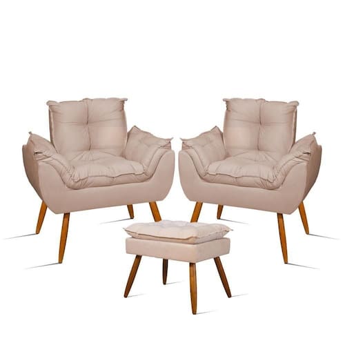 Transforme o seu ambiente com o Kit 02 Poltronas + 01 Puff Opala. Kit super multifuncional que une conforto, beleza e praticidade. Ideal para áreas de estar, cantinhos de leitura e até mesmo ambientes comerciais.