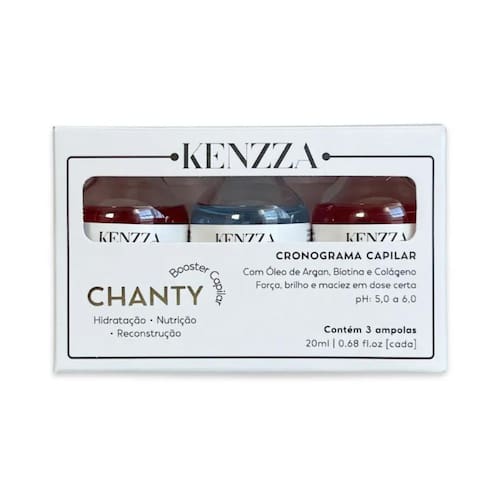 Ampolas Chanty Power Dose 3 unidades x 20ml Kenzza Alta Rentabilidade: até 3 aplicações em cada ampola Tratamento Intensivo em Dose Certa A nova linha de ampolas Kenzza foi desenvolvida para entregar resultados rápidos, eficazes e altamente concentrados, cuidando da saúde dos seus fios com precisão. Cada fórmula traz ativos potentes e específicos para as principais necessidades do cabelo, oferecendo soluções práticas tanto para o quanto para a rotina em casa. Com tratamentos divididos em etapas - hidratação, nutrição e reconstrução -, nossas ampolas são ideais para compor um cronograma capilar completo ou atender demandas pontuais, como fios ressecados, danificados ou sem brilho. Ampola Chanty Hidrata 20ml Kenzza 1 Revitalização Hidratante Express A Ampola Chanty Hidrata da Kenzza foi criada para oferecer um cuidado imediato e eficaz aos fios ressecados e opacos. Com uma fórmula concentrada e de rápida absorção, promove uma revitalização profunda, devolvendo a maciez, o brilho e a leveza que seu cabelo precisa. Enriquecida com ativos hidratantes de alta performance, é ideal para recuperar a saúde capilar em poucos minutos, sem pesar os fios. Ação instantânea Ideal para todos os tipos de cabelo Passo 1 do cronograma capilar Ampola Chanty Nutri 20ml Kenzza 2 Nutrição Intensa e Duradoura A Ampola Chanty Nutri da Kenzza foi desenvolvida para repor os lipídios essenciais dos fios, combatendo o ressecamento e o frizz de forma profunda e duradoura. Sua fórmula concentrada age diretamente na fibra capilar, devolvendo a emoliência, brilho e maciez, deixando os cabelos mais saudáveis, maleáveis e protegidos das agressões externas. Com ativos altamente nutritivos, é ideal para cabelos opacos, porosos ou com excesso de volume. Nutrição profunda Antifrizz e brilho imediato Passo 2 do cronograma capilar Ampola Chanty Reconstrói 20ml Kenzza 3 Reconstrução Capilar Intensiva A Ampola Chanty Reconstrói da Kenzza é a solução ideal para cabelos fragilizados, elásticos, quebradiços ou danificados por químicas e agressões externas. Sua fórmula concentrada atua diretamente na fibra capilar, promovendo uma reposição intensa de proteínas e aminoácidos, devolvendo a força, resistência e estrutura dos fios. Com ativos poderosos como colágeno e biotina, essa ampola é essencial para quem busca uma recuperação profunda e duradoura. Fortalecimento da fibra capilar Redução da quebra Passo 3 do cronograma capilar Modo de uso: Dilua 1 medida da ampola em 2 medidas de água morna e misture até formar um creme. Com os cabelos úmidos e limpos, aplique mecha por mecha. Deixe agir de 10 a 20 minutos, enxágue completamente e finalize conforme preferir.