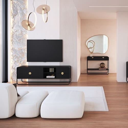 O Conjunto Aparador e Rack sao confeccionados em MDP com acabamento BP e pes metalicos. Conjunto significativo na hora de decorar e organizar a sala de estar, pois sao pecas versateis e funcionais. A linha Luna alia durabilidade e facilidade de manutencao, enquanto os pes metalicos trazem um toque contemporaneo e sofisticado, foi criada para refletir o equilibrio entre modernidade e funcionalidade. Inspirada em formas organicas e com design que valoriza os cantos arredondados, cada peca e pensada para se integrar com naturalidade aos mais diversos ambientes. Acabamento: BP Altura do Conjunto: 81 cm Ambiente: null Ambiente Principal: Sala de Estar codigo_ean: 7900288286505 Cor: Nero/Preto Cor do Produto: Nero/Preto Informação Complementar: 1x Aparador 2 Gavetas 100cm Orgânico Pé Metal Luna Nero/Preto Largura: 100 cm Altura: 81 cm Peso: 17,5 kg Profundidade: 37,5 cm Necessita Montagem: Sim