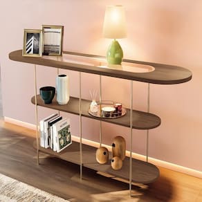 Por sua vez, o aparador conta com o tampo superior usinado com detalhe de vidro embutido, que não apenas encanta os olhos, mas também proporciona uma superfície prática para exibir suas melhores peças decorativas. As prateleiras oferecem amplo espaço para livros, objetos e lembranças, permitindo que você crie uma composição única e pessoal.