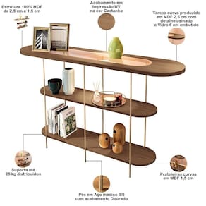 02 prateleiras curvas em MDF 15mm, com amplo espaço para objetos decorativos, livros e outros itens.
