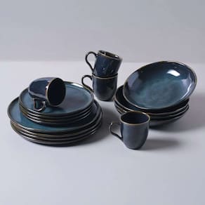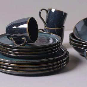 O conjunto combina o visual marcante do Stoneware, inspirado na profundidade e movimento do oceano, com a sofisticação minimalista do faqueiro Oslo, trazendo harmonia perfeita entre design, funcionalidade e elegância.