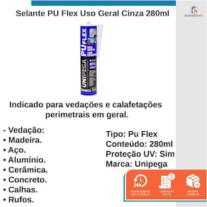 Aplicador De Silicone Fechado Starfer 9 pol.Indicado para aplicar silicone (massa) e outros produtos comercializados em tubo.O silicone para tubo de silicone da Starfer, é a ferramenta certa para você que trabalha na construção civil ou com pequenos reparos.Utiliza Tubos de Silicone até 280ml ou 9 Polegadas.Marca.: StarferRef.: 02002701O Selante PU Flex Uso Geral Cinza 280ml Unipega é indicado para vedações e calafetações perimetrais em geral. Veda madeira, aço, alumínio, cerâmica, concreto, calhas e rufos.Com propriedades de não escorrimento, cura com a umidade atmosférica, transformando-se em uma borracha flexível e resistente. Após a cura, pode ser pintado.- Cura à temperatura ambiente, formando uma borracha flexível.- Fácil de aplicar.- Pode ser aplicado em áreas internas e externas.- Ideal para calafetação e vedação.- Aceita pintura.Aplicação:A superfície deve estar seca, limpa, livre de pó e óleos. Remover todos os resíduos de materiais, especialmente os que não estão aderidos suficientemente às camadas (lixar, se necessário). Limpar e desengordurar a superfície com álcool isopropílico e a manter seca antes da aplicação. Não utilizar querosene ou gasolina para a limpeza das superfícies. Para melhor acabamento recomenda-se utilizar fita adesiva nas áreas laterais da junta onde não se pretende o contato do produto. No caso de aplicações em substratos diferentes dos mencionados recomenda-se realizar um teste para avaliar a adesão e compatibilidade do produto. Aplicar o produto na área desejada e imediatamente fazer o acabamento. No caso de uso de fita adesiva removê-la antes que forme película. Após o uso, deixar uma pequena quantidade de produto acima do bico para formar um tampão. Na reutilização, retirar o tampão. Após aberto reutilizar o produto em até uma semana. Limpar as ferramentas antes da cura.Orientações Gerais: O produto deve ser mantido na embalagem original e estocado em local fresco à temperatura de 5 a 30°C, ao abrigo da luz solar direta e longe de fontes de calor. Para evitar a contaminação do produto não utilizado, não retorne qualquer sobra de material em sua embalagem original. Mantenha fora do alcance de crianças e animais domésticos.Caracteristicas: Alongamento: 120 % (Após cura)Tempo de formação de película: 15 min.Tensão de Ruptura: 1,2 MPa (Após cura)Composição: Pré-polímero de poliuretano com silano modificado / Aditivos / Cargas Minerais / PigmentoCura total: 24 horasCor Predominante: CinzaDensidade: 1,70 g/cm3Dureza Shore A: 40 (Após cura)Proteção UV: SimTemperatura: -20ºC / +80ºC (Após cura)Textura: Sólido pastoso cinzaTipo: PU FlexConteúdo: 280mlMarca: UnipegaEAN: 7898652120435Modelo: Uso Geral - Cinza