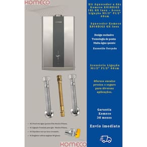 1 Kit Aquecedor Komeco 16DIG2 16L GN + Acess. Ligação De Aquecedor A Gás Komeco M1/2" F1/2" 40cm (02 Flexíveis de 40cm para água quente ou fria (1/2 pol. Macho / Fêmea), 01 Ligação Tomback de 40cm (1/2 pol. Macho / Fêmea) para gás, 03 Espelhos em aço inox cromado e 01 Registro esfera angular em L )