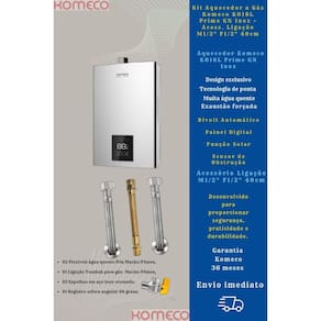 1 Kit Aquecedor Komeco KO16DIPRIME 16L GN Inox + Acess. Ligação De Aquecedor A Gás Komeco M1/2" F1/2" 40cm (02 Flexíveis de 40cm para água quente ou fria (1/2 pol. Macho/Fêmea), 01 Ligação Tomback de 40cm (1/2 pol. Macho /Fêmea) para gás, 03 Espelhos em aço inox cromado e 01 Registro esfera angular em L)