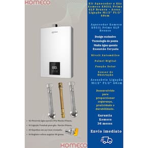 1 Kit Aquecedor Komeco KO21DPRIME 21L GLP + Acess. Ligação De Aquecedor A Gás Komeco M1/2" F1/2" 40cm (02 Flexíveis de 40cm para água quente ou fria (1/2 pol. Macho/Fêmea), 01 Ligação Tomback de 40cm (1/2 pol. Macho /Fêmea) para gás, 03 Espelhos em aço inox cromado e 01 Registro esfera angular em L)