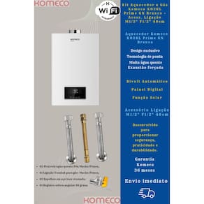 1 Kit Aquecedor Komeco KO26DPRIME 26L GN + Acess. Ligação De Aquecedor A Gás Komeco M1/2" F1/2" 40cm (02 Flexíveis de 40cm para água quente ou fria (1/2 pol. Macho / Fêmea), 01 Ligação Tomback de 40cm (1/2 pol. Macho / Fêmea) para gás, 03 Espelhos em aço inox cromado e 01 Registro esfera angular em L)