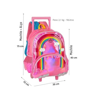 Mochila com rodas: Confeccionada em poliéster fechamento em zíper puxadores personalizados compartimentos espaçosos 2 bolsos laterais para garrafa possui rodas e alça de mão design exclusivo etiqueta de identificação na parte traseira Medidas aproximadas: Altura mochila+alça : 75 cm altura mochila : 40 cm largura: 15 cm comprimento: 30 cm
