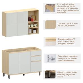 • Pintura: Armário: 4 Prateleiras Interna/Dobradiças Metálicas 35 mm com Amortecimento/2 Puxadores J em MDF 18 mm; Balcão: 1 Prateleira Interna/5 Puxadores J em MDF 18 mm/Pés na Cor Conhaque com Regulagem de Altura;