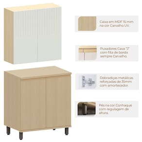 • Pintura: Armário: 1 Prateleira Interna/Dobradiças Metálicas com Amortecimento/2 Puxadores J em MDF 18 mm; Balcão: 2 Puxadores em J em MDF 18mm/1 Prateleira Interna/Pés na Cor Conhaque com Regulagem de Altura;