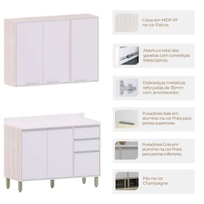 • Pintura: Armário: 5 Prateleiras Interna em Patina FF/Dobradiças Metálicas 35 mm com Amortecimento/3 Puxadores Aba em Alumínio Prata (Anodizado); Balcão: Estrutura e Prateleira em Patina FF/1 Prateleira Interna/5 Puxadores Gola em Alumínio Prata (Anodizado)/Dobradiças Metálicas 35 mm com Amortecimento/Pés na Cor Champanhe;