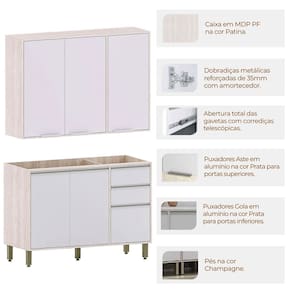 • Pintura: Armário: 5 Prateleiras Interna em Patina FF/Dobradiças Metálicas 35 mm com Amortecimento/3 Puxadores Aba em Alumínio Prata (Anodizado); Balcão: Estrutura e Prateleira em Patina FF/1 Prateleira Interna/5 Puxadores Gola em Alumínio Prata (Anodizado)/Dobradiças Metálicas 35 mm com Amortecimento/Pés na Cor Champanhe;