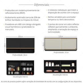 Montagem versátil e amplo espaço interno: Os 2 armários podem ser instalados separadamente, permitindo adaptações conforme o layout da sua cozinha e otimizando o espaço disponível. São 2 portas com puxadores em ABS e 2 portas de correr em vidro reflecta, garantindo fácil acesso e acomodação de diversos utensílios do dia a dia. O vidro reflecta, além de moderno e fácil de limpar, confere um toque sofisticado ao móvel e reflete parcialmente o ambiente, ampliando a sensação de espaço e luminosidade.