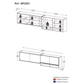 Especificações Técnicas: Dimensões do Produto Montado - Altura: 54cm (Aéreo Menor) - 45cm (Aéreo com Vidros) | Largura: 225cm | Profundidade: 32cm (Aéreo Menor) - 31cm (Aéreo com Vidros) Material: MDP Acabamento: Acetinado Quantidade de Portas de Correr: 2 Inclui Portas de Vidro: Sim Tipo de Vidro: Reflecta Puxadores: ABS