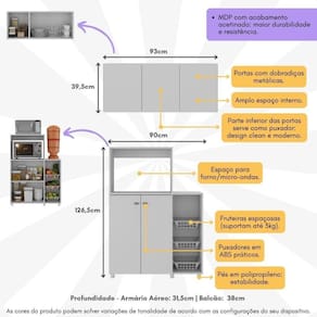 Dimensões do produto montado: Armário Aéreo - Altura: 39,5cm | Largura: 93cm | Profundidade: 31,5cm Balcão - Altura: 126,5cm | Largura: 90cm | Profundidade: 38cm *Você pode consultar as medidas detalhadas na imagem técnica do produto.