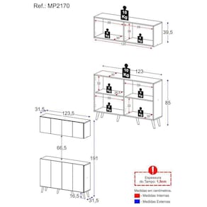 Dimensões do produto montado: Armário Aéreo - Altura: 39,5cm | Largura: 123,5cm | Profundidade: 31,5cm Balcão - Altura: 85cm | Largura: 123cm | Profundidade: 31,5cm *Você pode consultar as medidas detalhadas na imagem técnica do produto.