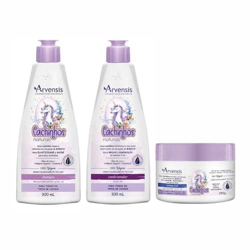 Kit Arvensis Cachinhos Shampoo Condicionador Máscara 2x1 A linha Cachinhos Naturais foi desenvolvida para atender aos mais diferentes tipos de ondinhas e cachinhos.Entendendo que o cabelo infantil 2,3 e 4 possui características próprias, a linha trata - de forma particular - os fios, conferindo inúmeros benefícios como nutrição avançada, reparação dos fios danificados, aumento da elasticidade, alta hidratação, maciez, brilho extra e um incrível efeito memória nos fios, além de combater o maldoso frizz. O Shampoo desenvolvido com uma formulação livre de sulfato e de sal, o shampoo Cachinhos Naturais é especial para a limpeza suave de todos os tipos de cabelos cacheados. 300ml - Sem Sal - pH 5,0 - 6,0 LOW POO O Condicionador Cachinhos Naturais é ideal para o tratamento de todos os tipos de cabelos cacheados, proporcionando inúmeros benefícios como nutrição avançada, reparação dos fios danificados, condicionamento equilibrado, maciez, brilho e controle do frizz. 300ml - pH 3,5 - 4,5 LOW POO A Máscara 2x1 foi desenvolvida para atuar como hidratante e finalizador de cabelos crespos e crespíssimos, o Creme Cachinhos Naturais 2X1 possui ação protetora e multifuncional - conferindo resistência, formação de filme e controle de frizz, além de manter a umidade natural e definir cachos nutridos radiantes. Contém filtro solar. 250g - pH 3,5 - 4,5 NO POO INDICAÇÃO: Cachos ondulados e cacheados 2A / 2B / 2C / 3A . O uso é recomendado apenas em crianças a partir dos 3 anos, neste caso deve ser aplicado exclusivamente por um adulto. Para crianças maiores de 5 anos: usar sob a supervisão de um adulto. PRINCIPAIS ATIVOS: Óleo de coco, colágeno vegetal, Abacate. Contém: - 01 shampoo 300ml - 01 condicionador 300ml- 01 Máscara 2x1 250g