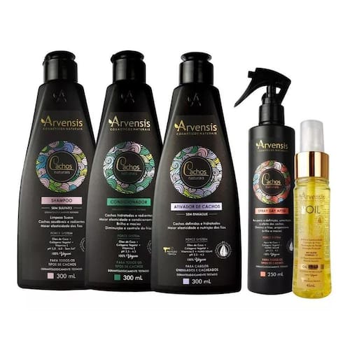 Kit arvensis cachos ondulados 4 itens + finalizador tec oilNeste anúncio contém:1 unidade shampoo cachos naturais arvensis 300ml1 unidade condicionador cachos naturais arvensis 300ml1 unidade creme ativador ondulados e cacheados arvensis 300ml1 unidade spray day after arvensis 250ml1 unidade finalizador oil repair tec oil 45ml Shampoo cachos naturais arvensis O shampoo cachos naturais foi desenvolvido com uma formulação livre de sulfato e sal, especial para a limpeza suave de todos os tipos de cabelos cacheados. Elaborado através da perfeita combinação de óleo de coco, colágeno vegetal e vitamina e, o shampoo cachos naturais proporciona inúmeros benefícios como reparação dos fios danificados, aumento da elasticidade, maciez e brilho extra. Sua ação protetora ainda confere resistência, formação de filme e controle de frizz, além de manter a umidade natural para cachos nutridos e radiantes. - ph 5-6 Indicação: todos os cachos. Condicionador cachos naturais arvensis O condicionador cachos naturais foi desenvolvido com uma formulação especial, ideal para a hidratação de todos os tipos de cabelos cacheados. Elaborado através da perfeita combinação de óleo de coco, colágeno vegetal e vitamina e, o condicionador cachos naturais proporciona inúmeros benefícios como nutrição avançada, reparação dos fios danificados, condicionamento equilibrado, aumento da elasticidade, maciez e brilho extra. Sua ação protetora ainda confere resistência e controle de frizz, além de manter a umidade natural para cachos nutridos e radiantes. Creme ativador cachos ondulados e cacheados arvensis A ação protetora do ativador de cachos ondulados e cacheados confere resistência, formação de filme, controle de frizz, mantendo a umidade natural e definindo cachos radiantes. Contém filtro solar. 300ml - ph 4,0 - 4,5 Indicação: cabelos ondulados e cacheados 2a / 2b / 2c / 3a . Principais ativos: óleo de coco; colágeno vegetal. Spray day after arvensis Os cabelos cacheados, muitas vezes, sofrem com o aspecto amassado, o frizz excessivo e a perda da definição dos cachos. Pensando nisso, a arvensis desenvolveu o day after, um spray com efeito memória que confere ultra definição aos cabelos, além de promover hidratação, elasticidade, controle do frizz, brilho e maciez. Com uma formulação enriquecida com filtro solar, protege os cabelos da ação nociva dos raios uv e da oxidação que leva ao envelhecimento precoce dos fios. 250ml ph 3,5 4,5 Indicação: todos os cachos. Principais ativos: água de coco; colágeno vegetal; filtro solar. Oil repair tec oil arvensis Com uma associação de 12 óleos preciosos e lendários, obtidos a partir de nozes, sementes, ervas e frutos, a linha tec oil foi desenvolvida para tratar os fios agredidos por agentes externos, desde a exposição ao sol e poluição até intervenções químicas que danificam a estrutura capilar. Proporciona nutrição profunda e avançada, além de proteção contra o ressecamento e ação disciplinante. Enriquecida com vitaminas a, e, b3, b5 e b6, a linha ainda confere proteção contra danos e selagem imediata das cutículas auxiliando no tratamento de fios extremamente danificados e pontas bipartidas. Indicação: cabelos danificados, com excesso de ressecamento. Principais ativos: bio elixir uma combinação de 12 óleos nobres , vitaminas a, e e do complexo b. Com toque seco, o óleo nobre tec oil confere brilho extra e luminoso aos fios, além de reparar as pontas duplas e diminuir o frizz. Contém filtro solar e protetor térmico. 45 ml
