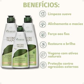 O Kit Arvensis Reconstrução é o tratamento completo ideal para cabelos danificados, quebradiços ou quimicamente tratados. Com fórmulas ricas em ativos reconstrutores, como proteínas, aminoácidos e extratos vegetais, ele atua profundamente na fibra capilar, devolvendo força, resistência, brilho e vitalidade aos fios. Limpa suavemente os fios e o couro cabeludo, removendo impurezas sem agredir. Prepara o cabelo para o tratamento reconstrutor, iniciando a recuperação da estrutura capilar desde a lavagem. Hidrata e desembaraça os fios, ajudando a selar as cutículas e repondo nutrientes essenciais. Promove mais maciez, brilho e elasticidade, reduzindo a quebra e o ressecamento. Protetor sem enxágue com ação reconstrutora e antifrizz. Fortalece os fios ao longo do dia, protege contra o calor térmico (secador, chapinha) e agressões externas, mantendo o cabelo alinhado, hidratado e com movimento natural.
