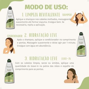 Condicionador: Após o uso do shampoo, aplique o condicionador do comprimento às pontas, massageando suavemente. Deixe agir por 1 minuto, em seguida, enxágue bem.