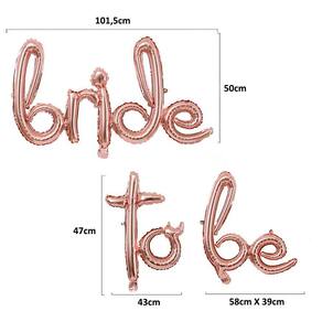Bride to be - balão metalizadoDetalhes do produtoBrideDimensão: 101x 50 cmMaterial: folha de metalizada e polietilenoToDimensão: 43cmx 47cmMaterial: folha de metalizada e polietilenoBeDimensão: 58,5cmx 39cmMaterial: folha de metalizada e polietilenoObservações:O balão é enviado vazioCom ar comum dura até 30 dias cheioVocê poderá usá-lo mais de uma vez, basta murchá-lo, guardá-lo e encher quando precisarPara esvaziar seu balão coloque um canudo delicadamente pela entrada de ar, e aperte-o com delicadeza até que saia por completo todo o ar.
