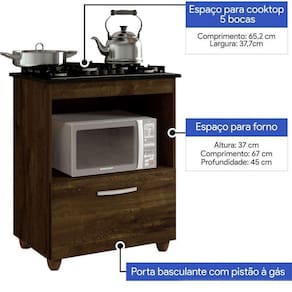 Especificações do Produto Montado Altura: 92 cm Largura: 74 cm Profundidade: 49 cm Peso: 17,5 kg Medida do Recorte para Cooktop: 65,2 cm x 37,7 cm Material do Puxador: Plástico Possui Pés: 04 Altura dos pés: 05 cm