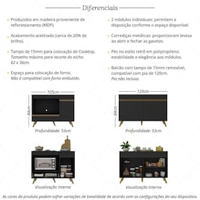 Versatilidade: O balcão de 105cm com tampo (15mm) é compatível com Cooktop de 4 ou 5 bocas e possui nicho para acomodar o seu forno, otimizando o espaço da cozinha. O recorte do tampo deve ser feito no momento da montagem, conforme o tamanho do seu Cooktop (tamanho máximo do nicho: 62 x 36cm). Versátil, o conjunto inclui um balcão com tampo que pode ser removido facilmente para colocação de uma pia de 120cm. Cooktop e pia não inclusos. Não é compatível com forno de embutir.
