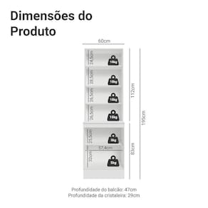 - 47 cm de profundidade no balcão e 29 cm na cristaleira