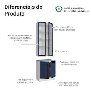 O acabamento de alta resistência da estrutura é em Branco, das frentes em Azul e possui uma textura suave ao toque. O destaque fica por conta do detalhe chanfrado das frentes, que forma molduras elegantes e dá profundidade ao design, refletindo o estilo americano com um toque moderno. Outro diferencial está nos puxadores ponto em ouro envelhecido, feitos com metal resistente, trazem personalidade e um charme único.