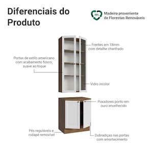 O acabamento de alta resistência da estrutura é em tom amadeirado Rustic, das frentes em Branco e possui uma textura suave ao toque. O destaque fica por conta do detalhe chanfrado das frentes, que forma molduras elegantes e dá profundidade ao design, refletindo o estilo americano com um toque moderno. Outro diferencial está nos puxadores ponto em ouro envelhecido, feitos com metal resistente, trazem personalidade e um charme único.