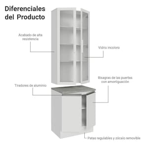 O móvel se destaca pelos detalhes de qualidade, como puxadores em alumínio no balcão, portas com amortecimento para um fechamento suave e pés reguláveis em PVC.