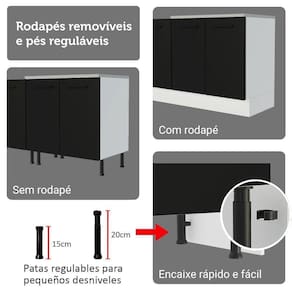 O móvel se destaca pelos detalhes de qualidade, como puxadores com alça em alumínio no balcão, portas com amortecimento para um fechamento suave e pés reguláveis em PVC.