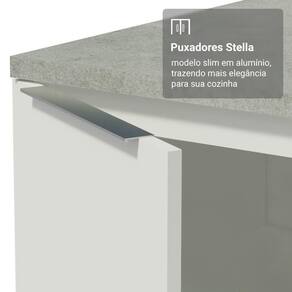 Destaque para a qualidade em cada detalhe, como puxadores slim em alumínio no balcão, portas com amortecimento para um fechamento suave e pés reguláveis em PVC.