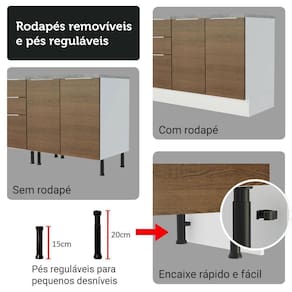 Destaque para a qualidade em cada detalhe, como puxadores slim em alumínio no balcão, portas com amortecimento para um fechamento suave e pés reguláveis em PVC.