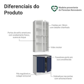O acabamento de alta resistência da estrutura é em Branco, das frentes em Azul e Branco e possui uma textura suave ao toque. O destaque fica por conta do detalhe chanfrado das frentes, que forma molduras elegantes e dá profundidade ao design, refletindo o estilo americano com um toque moderno. Outro diferencial está nos puxadores ponto em ouro envelhecido, feitos com metal resistente, trazem personalidade e um charme único.