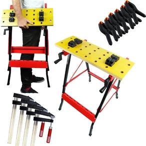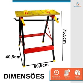 - Bancada portátil de trabalho e ferramentas; - Com barra transversal onde pode ser utilizado como porta ferramentas; - Ideal para trabalhos como lixar, pintar, apoiar, prensar, servir de suporte, entre outros; - Bancada de trabalho ajustável portátil dobrável em alumínio com tampo de madeira; - Presilhas ajustáveis e régua; - Com manivelas para ajuste do tampo de madeira. - Possui 4 mordentes ajustáveis manualmente para fixação.