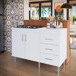 Ótima Capacidade de Armazenamento: As portas e gavetas permitem armazenar utensílios, panelas e mantimentos de forma organizada.