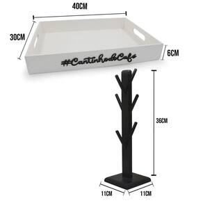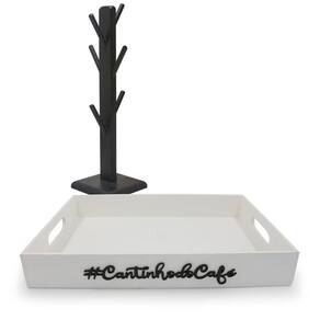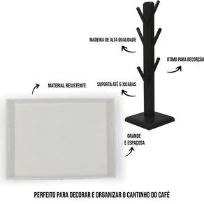 Kit bandeja cantinho do café porta xícaras suporte 6 pinos b Bandeja versátil e multiuso: Feita em mdf de 6mm com pintura em tinta acrílica na cor preta ela é ideal para organizar o seu lar, servir um cafezinho para os amigos, organizar papeis de escritório entre diversas outras utilidades. Bandeja versátil, barata e de qualidade, combinando com todos os ambientes no qual estiver Suas medias são40x30x6 externa 38,5 x 28,5 x 5,5 na parte interna Possui as laterais vazadas como uma alça. Porta xícaras 6 pinos:Esse é o produto ideal para decorar o seu tão especial cantinho do café ou até mesmo presentear uma pessoa querida, além da beleza o porta xícaras é feito em mdf que é muito resistente, ideal até 6 xícaras/canecas de 240ml. Com esse porta xícaras você vai conseguir deixar seus armários muito mais organizados. Medidas suporte:Altura: 36 cmBase: 11x11Peso: 282gMaterial de composição: mdf Obs: xícaras e porta capsulas não inclusos